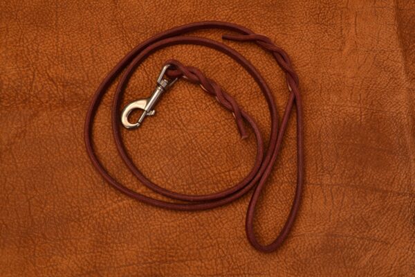 Ručně pletené kožené vodítko o tloušťce 10mm s nerezovou karabinou. Vhodné pro střední a velká plemena psů.
